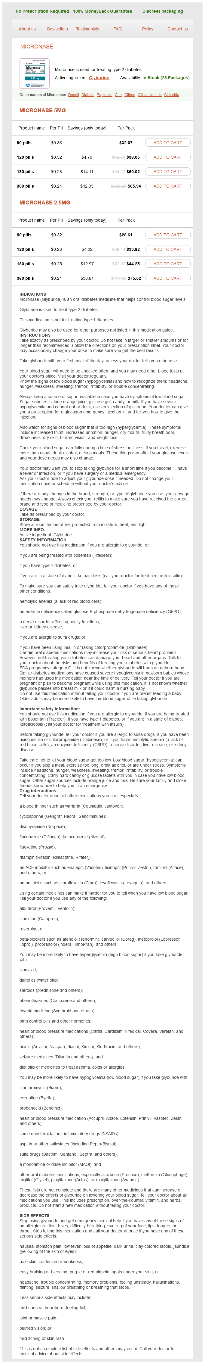 Micronase packs: 90 pills, 120 pills, 180 pills, 360 pills
