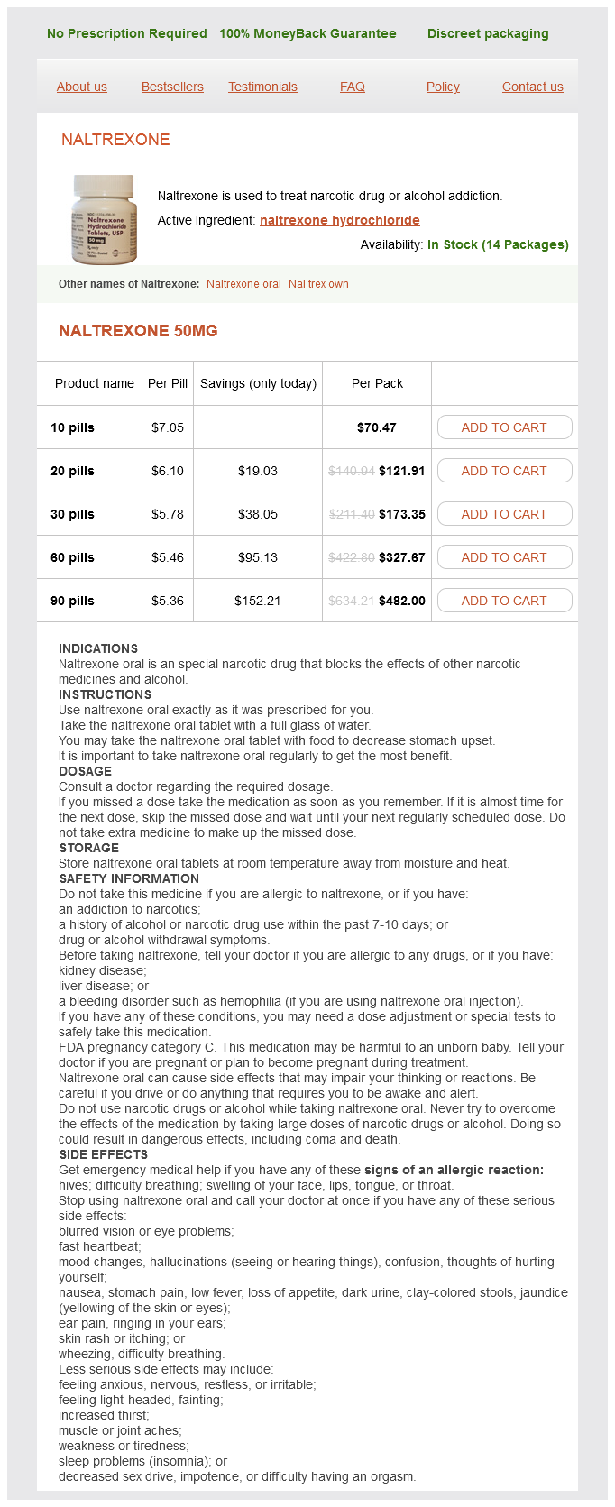 Naltrexone packs: 10 pills, 20 pills, 30 pills, 60 pills, 90 pills