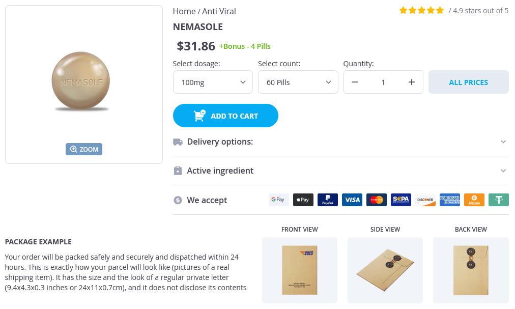 Nemasole packs: 60 pills, 90 pills, 120 pills, 180 pills, 270 pills, 360 pills