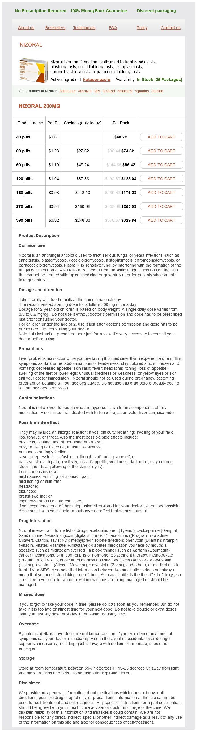 Nizoral packs: 30 pills, 60 pills, 90 pills, 120 pills, 180 pills, 270 pills, 360 pills