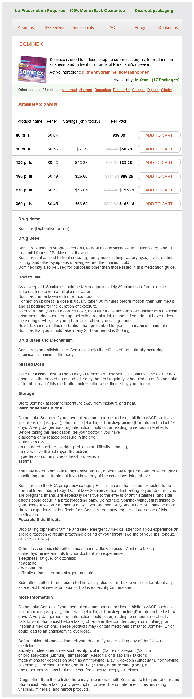 Sominex packs: 60 pills, 90 pills, 120 pills, 180 pills, 270 pills, 360 pills