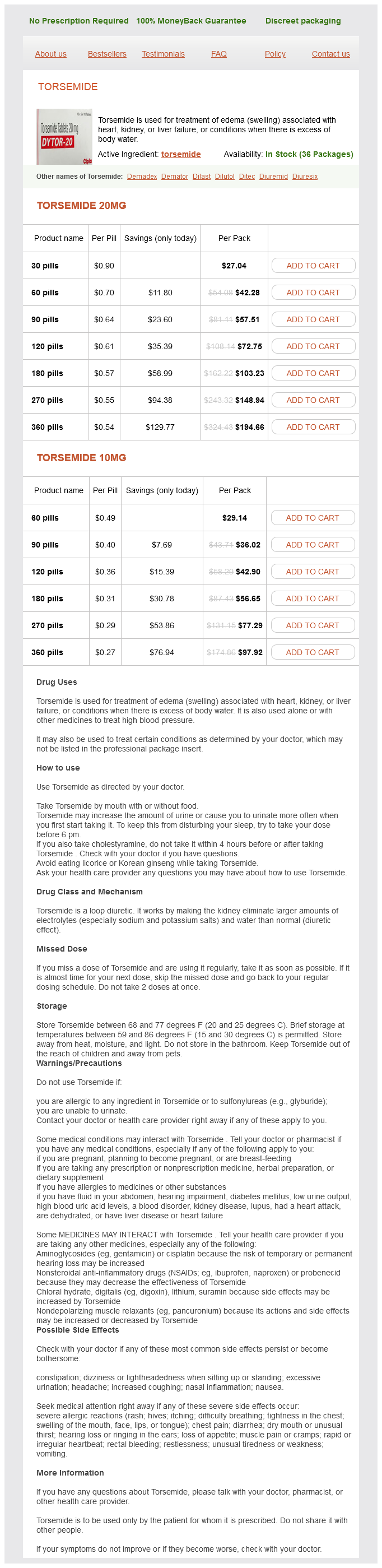 Torsemide packs: 30 pills, 60 pills, 90 pills, 120 pills, 180 pills, 270 pills, 360 pills