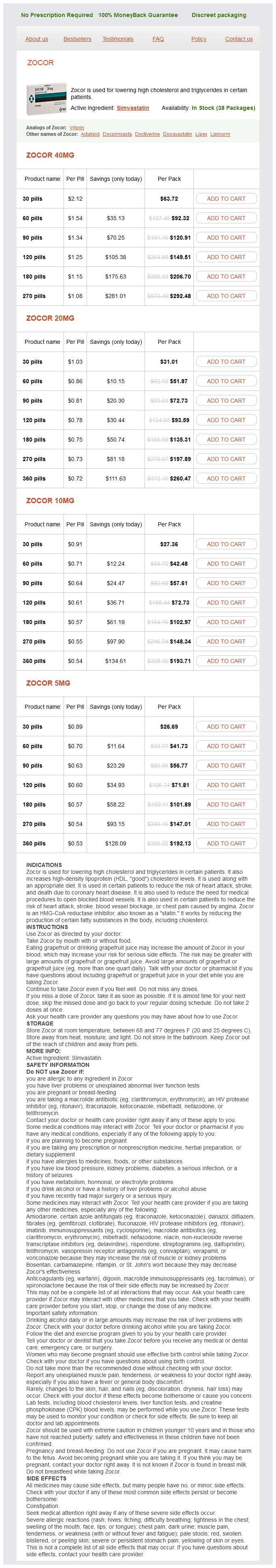 Zocor packs: 30 pills, 60 pills, 90 pills, 120 pills, 180 pills, 270 pills, 360 pills