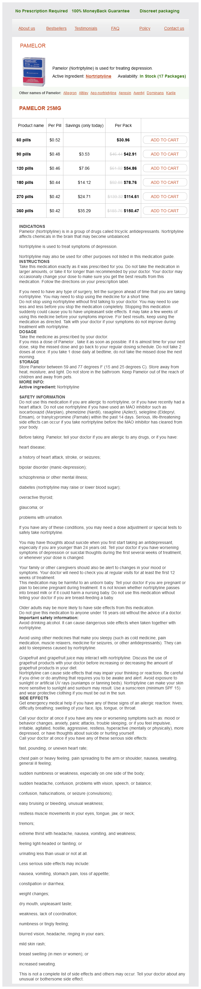 Furthermore anxiety yoga purchase nortriptyline 25 mg visa, these incidence estimates have increased in recent years anxiety symptoms for hiv purchase nortriptyline master card, consistent with gout prevalence estimates anxiety symptoms in children checklist order 25 mg nortriptyline free shipping. Population studies show a direct positive (linear to exponential) relation between serum urate levels and a future risk of gout anxiety symptoms 4 weeks nortriptyline 25 mg buy on-line. This leads to a substantially higher risk of gout among men than women anxiety 4 year old boy purchase nortriptyline 25 mg on line, particularly before menopause. African Americans have higher serum uric acid levels than European Americans,19 linked to the increased prevalence of hypertension among the former. Adiposity Adiposity is one of the strongest risk factors for hyperuricemia and gout. Prospective cohort studies have consistently found a strong relation between higher adiposity (or weight gain) and an increased risk of both hyperuricemia and incident gout. Men in the highest quintile of seafood intake were found to have a 51% higher risk of gout compared with the lowest quintile. Choose fish, poultry, beans, nuts; limit red meat; avoid bacon, cold cuts, and other processed meats. Directional arrows and blue font information are specific to gout and are not found in the original healthy eating plate. Upward red arrows denote an increased risk of gout, and downward green arrows denote a decreased risk. Dotted green arrows denote a potential effect but without prospective evidence for the outcome of gout. The references on the relation between diet and the risk of gout are listed in Table 189. Other major contributors to fructose intake such as sugary fruit juice or fructose-rich fruits. Coffee, teas, and caffeine Coffee consumption may lower serum uric acid levels and the risk of gout in the long term via various mechanisms. When dairy intake was stratified by fat content, the protective association persisted with low-fat dairy consumption, but the association became null with high-fat dairy consumption. Several observational studies from Taiwan88 and the United States89,90 have extended evidence of an inverse link between vitamin C intake and risk of hyperuricemia or incident gout. Purine-rich vegetables, vegetable protein, and cherries Contrary to traditional dietary approaches, the consumption of purine-rich vegetables was not found to be associated with the risk of incident gout (see Table 189. Men in the highest quintile of vegetable protein consumption actually showed a 27% lower risk of gout compared with the lowest quintile. Compatible with these urate-affecting properties, a recent population-based study revealed that calcium channel blockers and losartan were associated with a lower risk of incident gout among individuals with hypertension (see Table 189. To that effect, diets against the metabolic syndrome and high glycemic index, which have also shown uratelowering effects,104,105 may provide an ideal strategy to reduce both the risk of gout and its associated comorbidities. Traditional lifestyle approaches to prevent gout have almost exclusively focused on the purine-loading risk factors. However, factors that increase insulin resistance and thus decrease the renal excretion of urate can increase uric acid levels and the risk of gout. National prevalence of gout derived from administrative health data in Aotearoa New Zealand. Prevalence of chronic arthritis in four geographical areas of the Scottish Highlands. The prevalence of hyperuricemia in a population of the coastal city of Qingdao, China. Dietary and lifestyle changes associated with high prevalence of hyperuricemia and gout in the Shandong coastal cities of Eastern China. Preliminary criteria for the classification of the acute arthritis of primary gout. Veterans Affairs databases are accurate for gout-related health care utilization: a validation study. Estimates of the prevalence of selected arthritic and musculoskeletal diseases in the United States. Beer, liquor, and wine consumption and serum uric acid level: the Third National Health and Nutrition Examination Survey. Ethanol-induced hyperuricemia: evidence for increased urate production by activation of adenine nucleotide turnover. Sugar-sweetened soft drinks, diet soft drinks, and serum uric acid level: the Third National Health and Nutrition Examination Survey. Caffeinated coffee, decaffeinated coffee, and caffeine in relation to plasma C-peptide levels, a marker of insulin secretion, in U. Coffee, tea, and caffeine consumption and serum uric acid level: the Third National Health and Nutrition Examination Survey. The relation of coffee consumption to serum uric acid in Japanese men and women aged 49-76 years. Inverse association between coffee drinking and serum uric acid concentrations in middle-aged Japanese males. The effects of vitamin C supplementation on serum concentrations of uric acid: results of a randomized controlled trial. The effect of mini-dose aspirin on renal function and uric acid handling in elderly patients. Antihypertensive drugs and risk of incident gout among patients with hypertension: population based case-control study. Effect of low level lead exposure on hyperuricemia and gout among middle aged and elderly men: the Normative Aging Study. Prevalence of the metabolic syndrome in patients with gout: the Third National Health and Nutrition Examination Survey. Gout and the risk of type 2 diabetes among men with a high cardiovascular risk profile. Beneficial effects of weight loss associated with moderate calorie/ carbohydrate restriction, and increased proportional intake of protein and unsaturated fat on serum urate and lipoprotein levels in gout: a pilot study. Effects of lowering glycemic index of dietary carbohydrate on plasma uric acid levels: the OmniCarb Randomized Clinical Trial. Sleep apnea and the risk of incident gout: a population-based, body